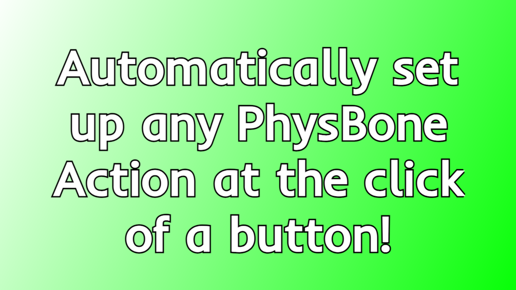 With VRChat's Upcoming New update. I've gone through the documentation for the new update and made this asset. AutoPhysActions automatically adds the 3 possible actions that can happen when you/others interact with PhysBones. Grab Actions, Angle Actions and Stretch Actions.